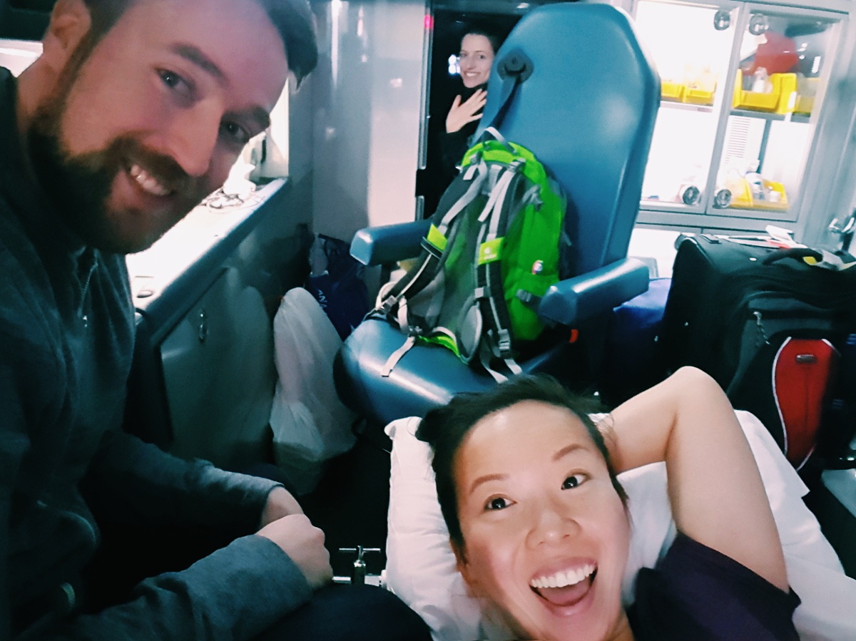 Obviously, not all of them, one lady was super nice and helped me take off my shoes (because I can’t bend forward and is essentially a child) and another was always super nice when he had to go get S to medicate me. The other ones doe…. I essentially got scolded for asking for food in the middle of the night because I was hungry. The old Asian lady stewardess reluctantly brought over a fruit basket when I asked for fruit and chastised me when I tried to take a banana AND an orange. She lectured me about how her giant fruit basket has to feed TWENTY other people. Lady, the flight was like 3/4 over and no one else had even asked for fruit. And besides, for FIVE THOUSAND DOLLAS you’d think I could have 2 dollars worth of fruit. The kicker? Basket was untouched by anyone else when we landed. Maybe I just have a face that old Asian ladies like to scold?